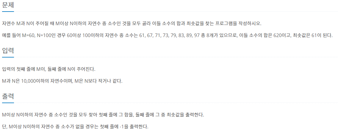 백준 알고리즘 2581번 문제는 다음과 같습니다.