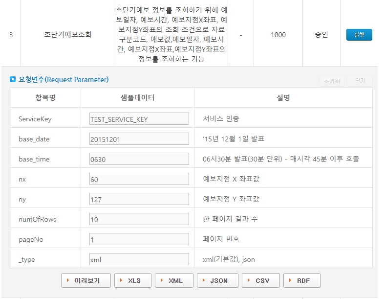 아래에 내려보면 동네예보조회에 실행이 있고, 미리보기로 테스트가 가능하다.