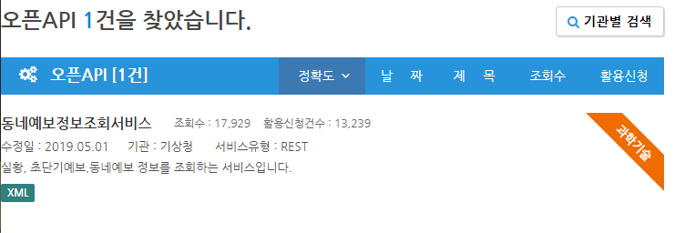 https://www.data.go.kr/search/index.do 사이트에서 "동네에보정보조회서비스"를 검색하면 오픈 API를 찾을 수 있다.