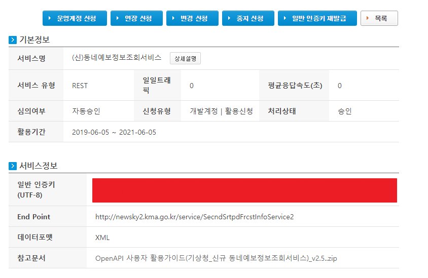 동네예보정보조회 서비스에 들어가 키를 발급받아 준다.