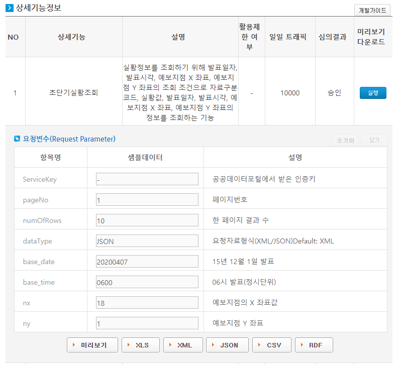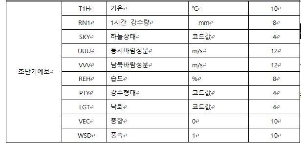 (초단기예보는 시간마다 주는 데이터 양이 다름. 상세 내용은 개발문서 확인)