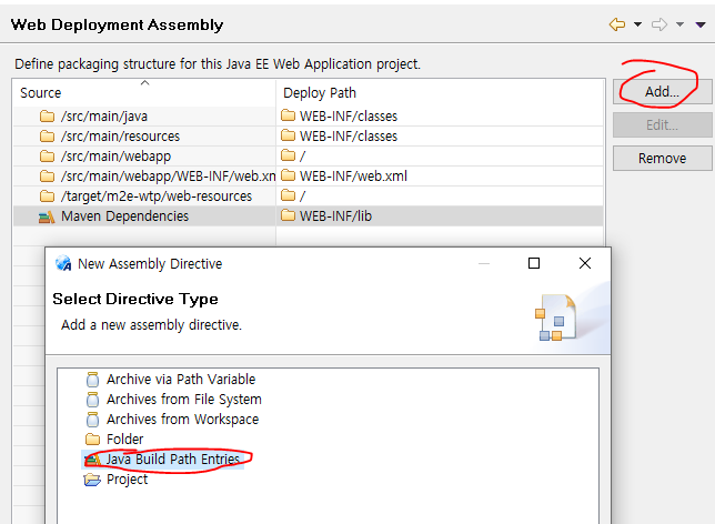 Maven Dependencies가 없다면 Add -> Java Build Path Entries 를 통하여 추가해 주면 된다.