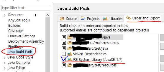 해당 프로젝트 우클릭 -> Properties -> Java Build Path -> Order and Export 탭에서 JRE System Library를 체크하라고 한다.