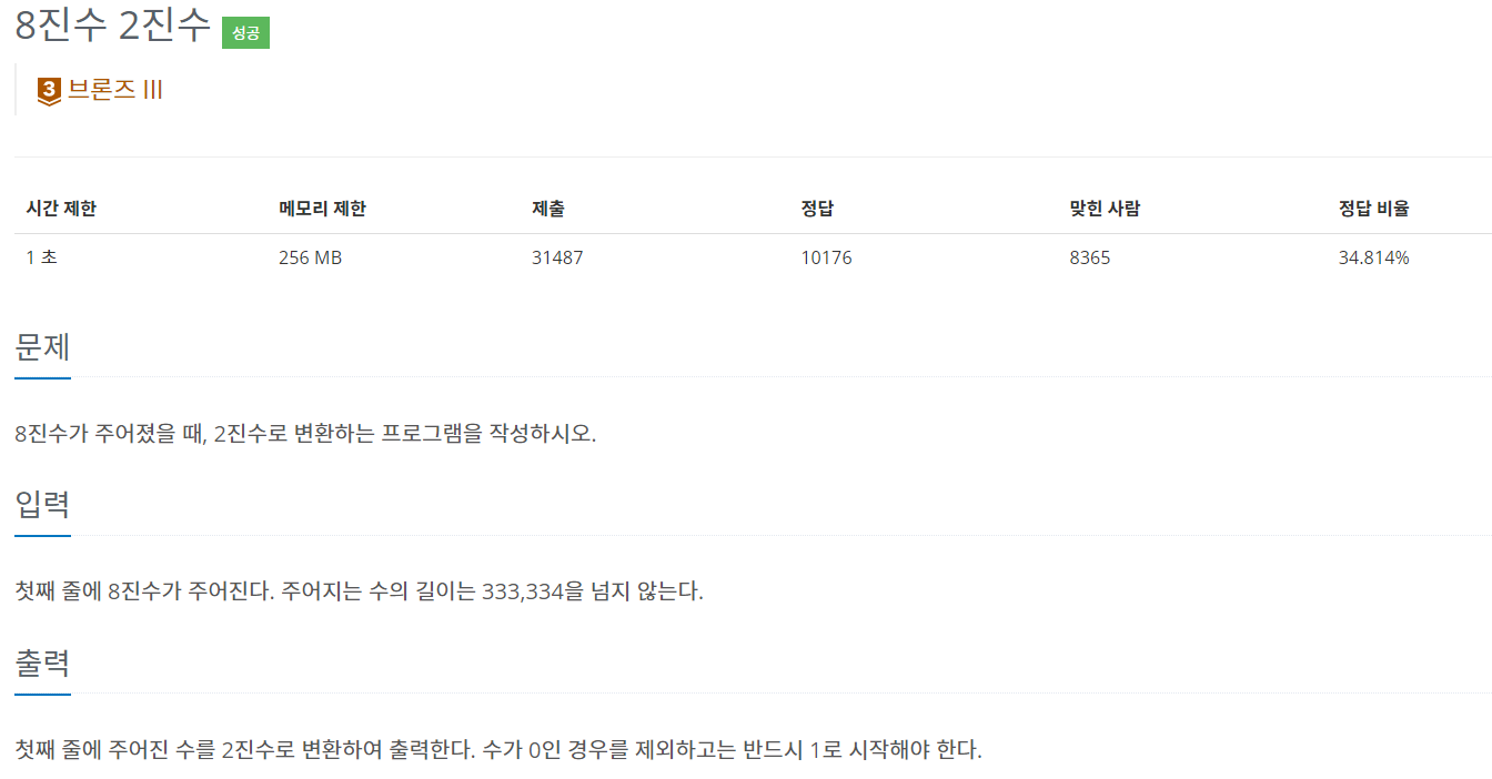 진법변환은 오랜만이라 처음 문제를 풀기위하여 8진수를 10진수로 변환 후 2진수로 변환하였다.