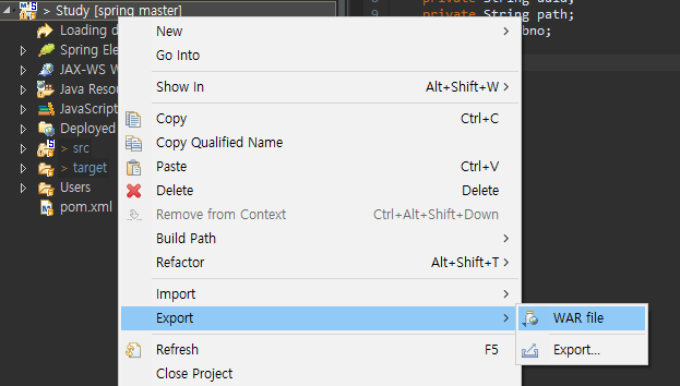 해당 프로젝트를 우클릭 후 Export에 가면 WAR File이 있다. 없다면 Export를 클릭하여 war을 검색하면 나온다.