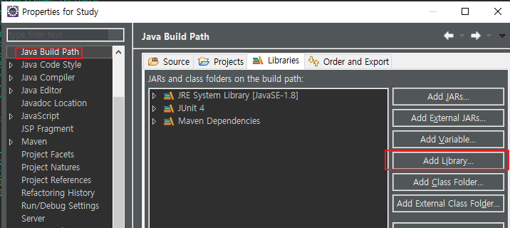 해당 프로젝트 우클릭 -> Java Build Path -> Add Library