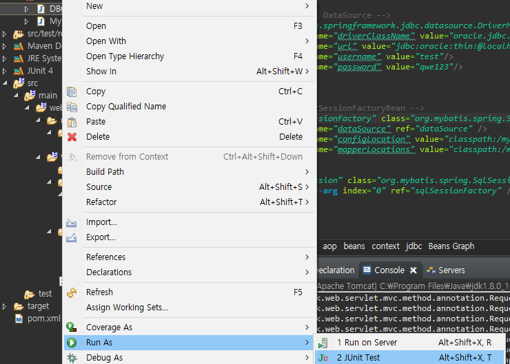 그다음 다시 Source로 돌아가 root-context.xml에 다음의 내용을 추가하여 oracle DB와 mybatis 연결을 설정한다.