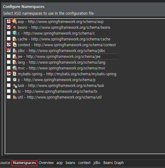 root-context.xml파일을 열어 Namespace를 누르면 다음과 같은 화면이 나온다. 아래와 같이 체크를 해주면 된다.