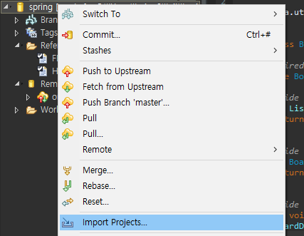 2. 깃헙과 연동이 되었다면, 프로젝트를 우클릭하여 import Projects를 클릭해 준다.