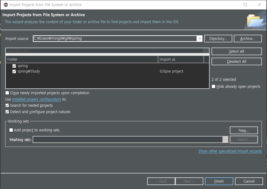 3. import될 프로젝트의 위치를 지정해 주는 것인데 그냥 Finish를 눌러주면 된다.
