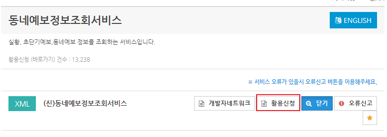 https://www.data.go.kr/search/index.do 사이트에서 "동네에보정보조회서비스"를 검색하면 오픈 API를 찾을 수 있다.
