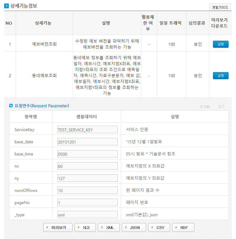 아래에 내려보면 동네예보조회에 실행이 있다. 미리보기로 테스트가 가능하지만