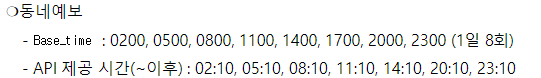 ServiceKey 항목에는 발급받은 키값을 넣어주고 base_date에는 날짜를 적어주어야 하는데 오늘이나 내일 날짜밖에 안된다. base_time은 조회를 원하는 시간이다 02시부터 3시간 단위로 조회를 할 수 있다.