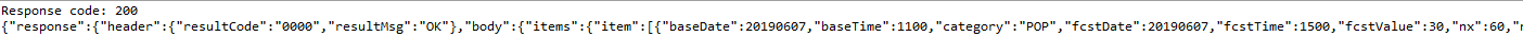 이렇게 해서 받아오게 되면 아주 길고 보기 힘든 값이 넘어온다.. 이 값을 잘라서 써도 되지만, JSON 라이브러리를 사용하면 보기 편하다..